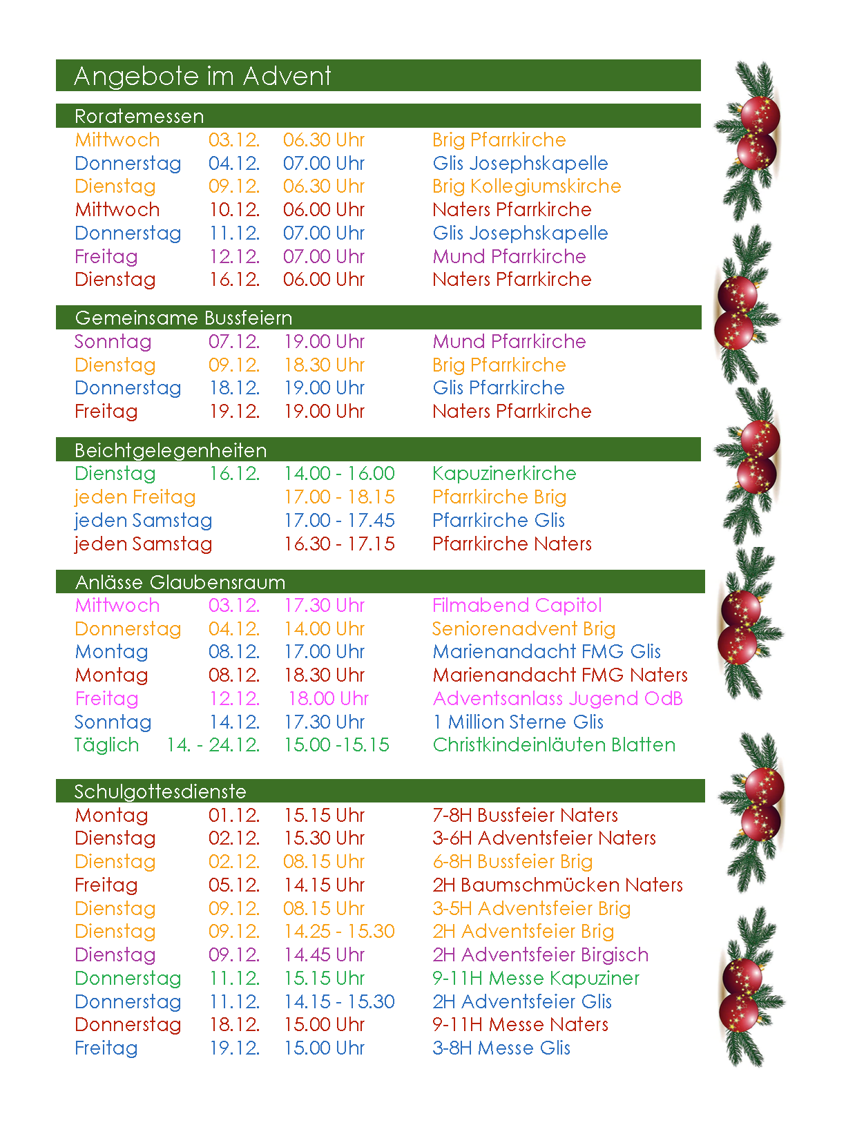 Roratemessen, Beichtgelegenheiten, Bussfeiern, Schulgottesdienste, besondere Anlässe… Eine Übersicht